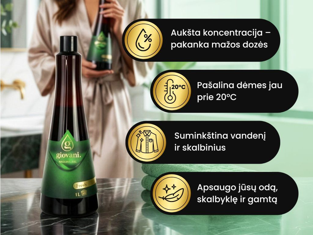 Skalbimas nebūtinai turi būti nuobodi prievolė. Naudojant Giovani® FRESH skalbimo gelį, jis tampa gaivinančia patirtimi. Šis itin koncentruotas gelis ne tik puikiai išskalbia jūsų drabužius, bet ir apgaubia juos švelniu žaliuojančio atogrąžų miško kvapu, kuris suteikia jūsų drabužiams gaivumo, švaros ir harmonijos pojūtį.