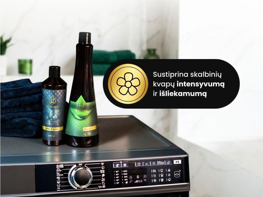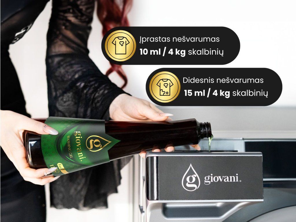 Kaip naudoti Giovani® FRESH?Skystą skalbiklį pilkite į tam skirtą skyrelį skalbimo mašinoje. Naudokite 10 ml koncentrato 4 kg skalbinių. 1000 ml pakuotės pakanka net iki 100 skalbimų. Skalbiklis netinka vilnai ir šilkui. Šioms medžiagoms reikalinga speciali priežiūra – be fermentų ir stipraus gręžimo. Giovani® FRESH skalbiklį rekomenduojame derinti su prabangiomis mūsų gaivių ir aitraus aromato skalbinių kvepalų kompozicijomis. Skalbiklio kvapas neužgožia kvapų, priešingai, juos sustiprina ir išryškina. |