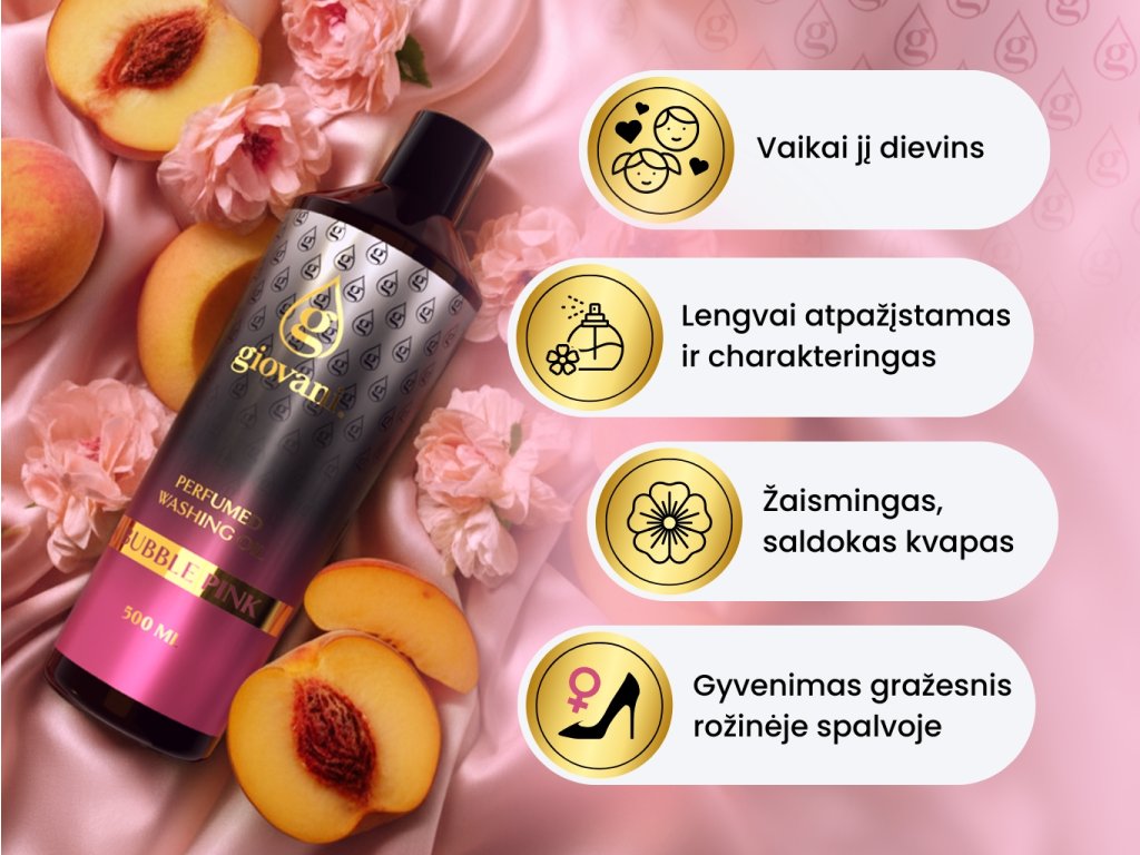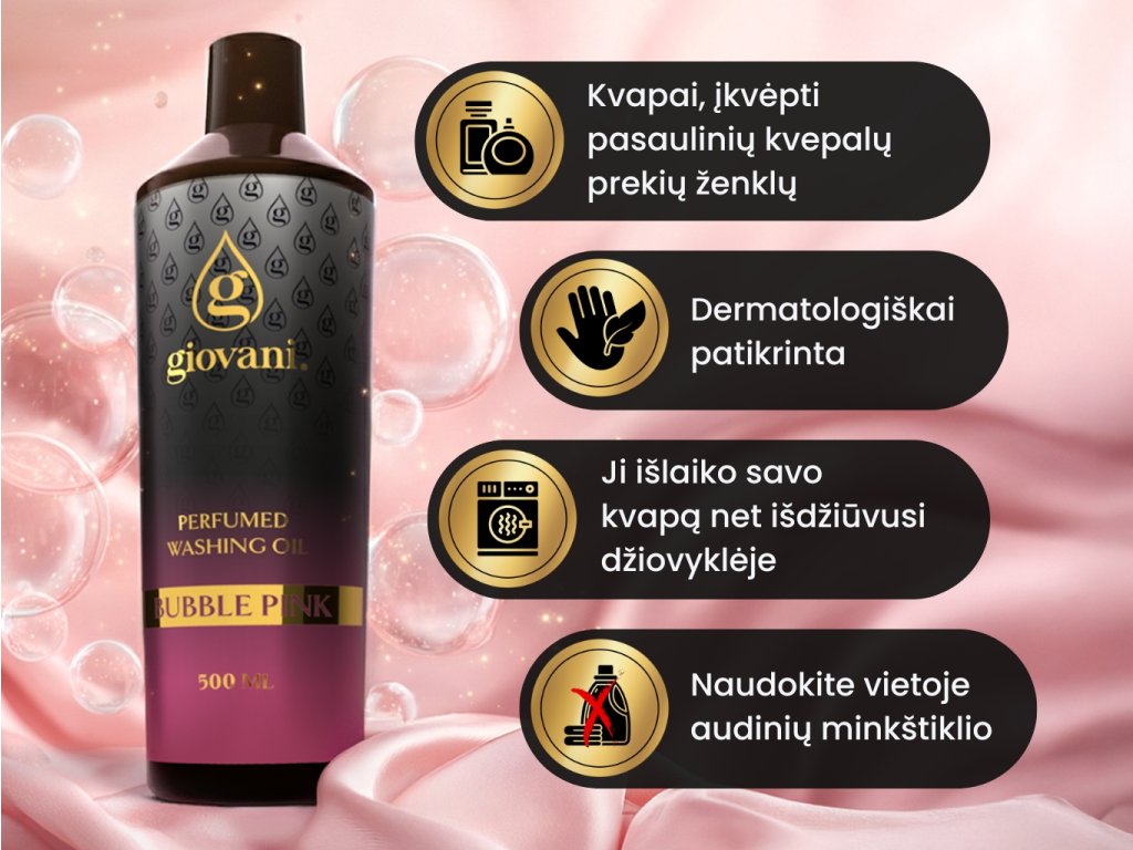 Atraskite neatsispiriamą saldumą su žavingais Giovani® skalbinių kvepalais Bubble Pink. Unikalus saldžiųjų esencijų derinys sukuria intensyvų ir ilgai išliekantį kvapą, kuris apgaubs Jūsų skalbinius viliojančiu aromatu.