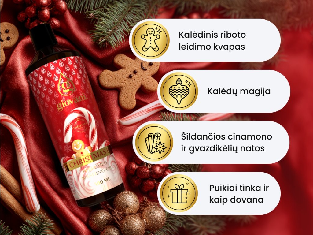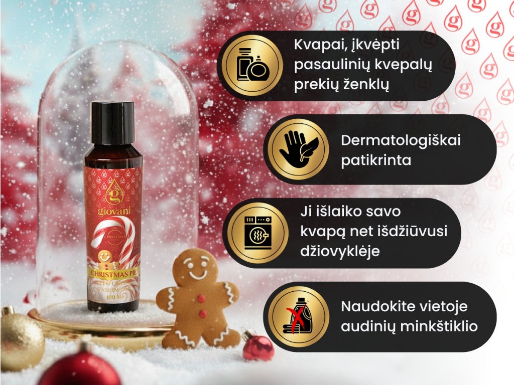 Įsivaizduokite Kalėdų kvapą ir ore tvyrančią atmosferą. Kalėdinis Giovani® CHRISTMAS PIE skalbinių kvepalų leidimas apgaubs jūsų skalbinius ir namus šventine atmosfera, kuri išliks kelias savaites po kiekvieno skalbimo.