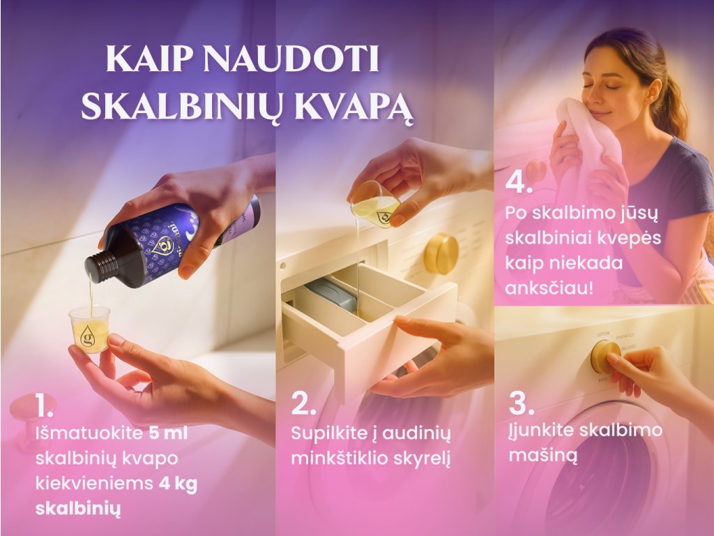 Nepilkite kvepalų į skalbyklės būgną ar džiovyklę. Jie skirti tiesiogiai naudoti audinių minkštiklio skyriuje. Jums nereikia nerimauti, kad džiovinant skalbinius džiovyklėje jie praras kvapą. Giovani® kvepalai yra atsparūs išoriniam poveikiui ir ilgai išliekantys. Išskalbti skalbiniai kvepės net ir po džiovyklės naudojimo. Optimali skalbinių kvepalų laikymo temperatūra yra apie 15-25°C.