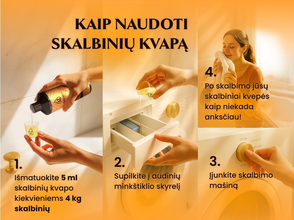 Nepilkite kvepalų į skalbyklės būgną ar džiovyklę. Jie skirti tiesiogiai naudoti audinių minkštiklio skyriuje. Jums nereikia nerimauti, kad džiovinant skalbinius džiovyklėje jie praras kvapą. Giovani® kvepalai yra atsparūs išoriniam poveikiui ir ilgai išliekantys. Išskalbti skalbiniai kvepės net ir po džiovyklės naudojimo. Optimali skalbinių kvepalų laikymo temperatūra yra apie 15-25°C.