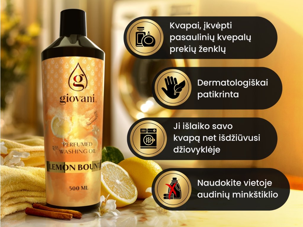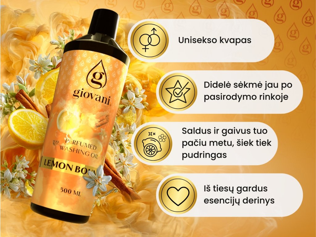 Giovani® yra išskirtinis ir prabangus skalbinių kvepalų prekės ženklas. Labai stengiamės užtikrinti aukštą savo produktų kokybę. Kuriant šiuos kvepalus mums buvo svarbu pasiekti intensyvų ir ilgai išliekantį aromatą, kad apie Giovani® galėtume kalbėti kaip apie aukščiausios kokybės skalbinių kvepalų prekės ženklą rinkoje. Vienas iš pagrindinių mūsų kvepalų privalumų – jie neužkemša skalbyklės, nepalieka riebalų likučių ir nedažo drabužių. Dėl sudėtyje esančių specialių medžiagų mūsų kvepalai taip pat rūpinasi spalva. Jie yra veganiški, juose nėra dioksano, SVHC, parabenų, tenzidų, sunkiųjų metalų, mikroplastiko ar nanoplastiko. Prie Giovani® prekės ženklo išskirtinumo prisideda ir prabangus dizainas. Taip pat didžiuojamės pristatymu per 24 valandas ir greitu klientų aptarnavimu. |