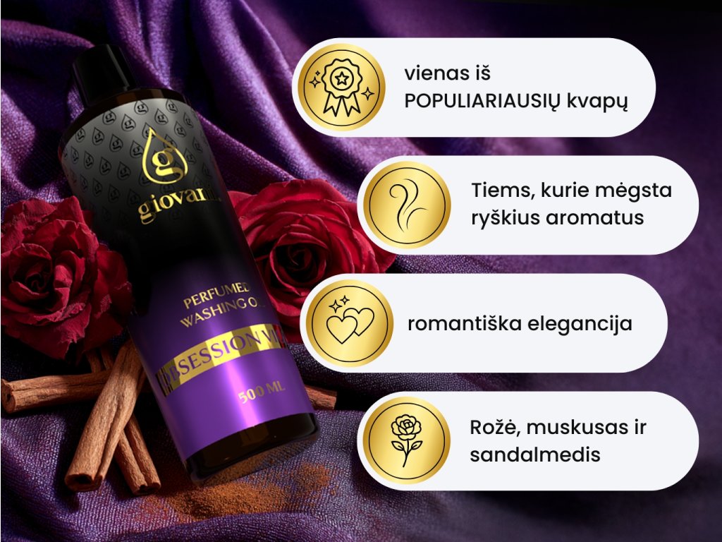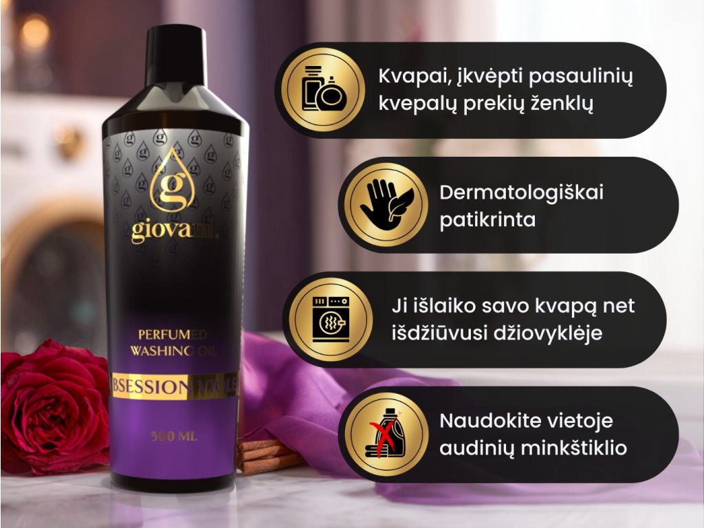 Giovani® yra išskirtinis ir prabangus skalbinių kvepalų prekės ženklas. Labai stengiamės užtikrinti aukštą savo produktų kokybę. Kuriant šiuos kvepalus mums buvo svarbu pasiekti intensyvų ir ilgai išliekantį aromatą, kad apie Giovani® galėtume kalbėti kaip apie aukščiausios kokybės skalbinių kvepalų prekės ženklą rinkoje. Vienas iš pagrindinių mūsų kvepalų privalumų – jie neužkemša skalbyklės, nepalieka riebalų likučių ir nedažo drabužių. Dėl sudėtyje esančių specialių medžiagų mūsų kvepalai taip pat rūpinasi spalva. Jie yra veganiški, juose nėra dioksano, SVHC, parabenų, tenzidų, sunkiųjų metalų, mikroplastiko ar nanoplastiko. Prie Giovani® prekės ženklo išskirtinumo prisideda ir prabangus dizainas. Taip pat didžiuojamės pristatymu per 24 valandas ir greitu klientų aptarnavimu. |