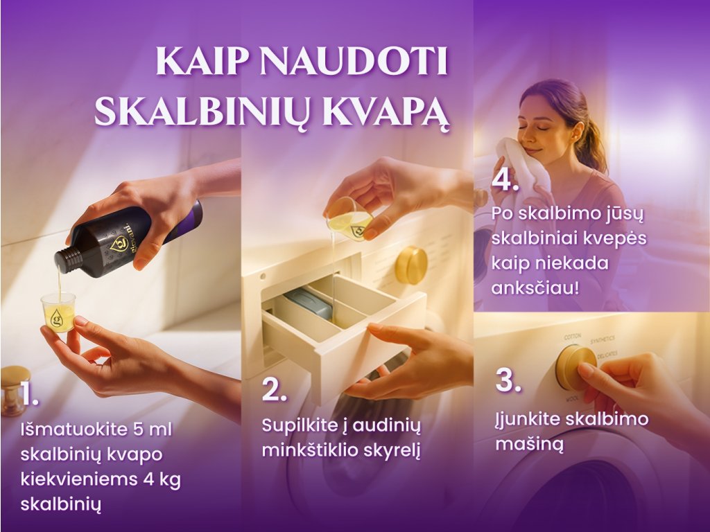 Nepilkite kvepalų į skalbyklės būgną ar džiovyklę. Jie skirti tiesiogiai naudoti audinių minkštiklio skyriuje. Jums nereikia nerimauti, kad džiovinant skalbinius džiovyklėje jie praras kvapą. Giovani® kvepalai yra atsparūs išoriniam poveikiui ir ilgai išliekantys. Išskalbti skalbiniai kvepės net ir po džiovyklės naudojimo. Optimali skalbinių kvepalų laikymo temperatūra yra apie 15-25°C.