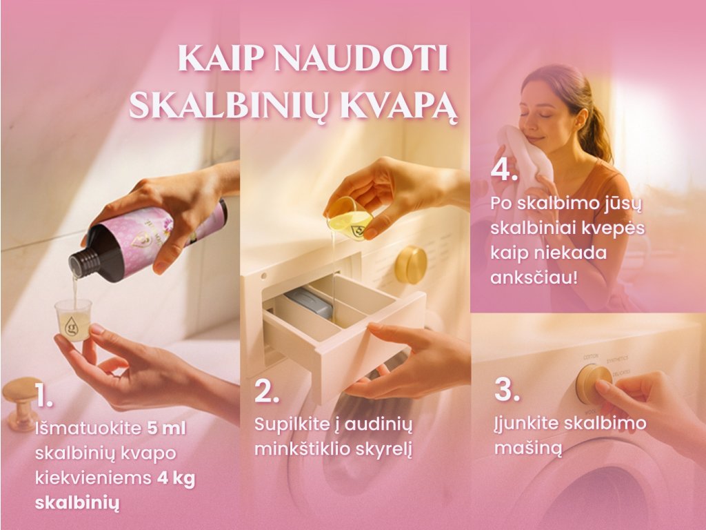 Naudojimas: Įpilkite 5 ml koncentrato į skalbinių minkštiklio talpyklą. Šis kiekis atitinka 4 kg skalbinių. Koncentratas neskiedžiamas. Dozavimui galite naudoti Giovani® skalbinių kvepalų dangtelį, kuris atitinka 3 ml; rekomenduojame naudoti dvigubą kiekį. Kad dozavimas būtų dar patogesnis, galite įsigyti matuoklį su mūsų logotipu arba dozavimo pompą. Pakanka nedidelio kiekio, ir jūsų skalbiniai kvepės nepriekaištingai!