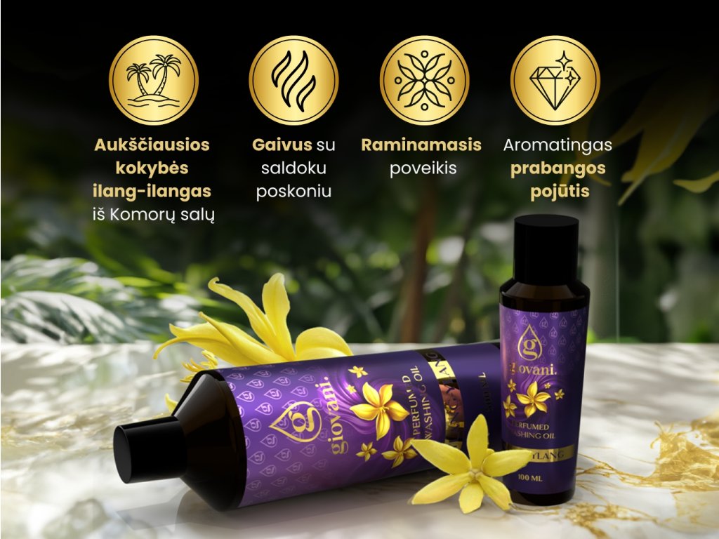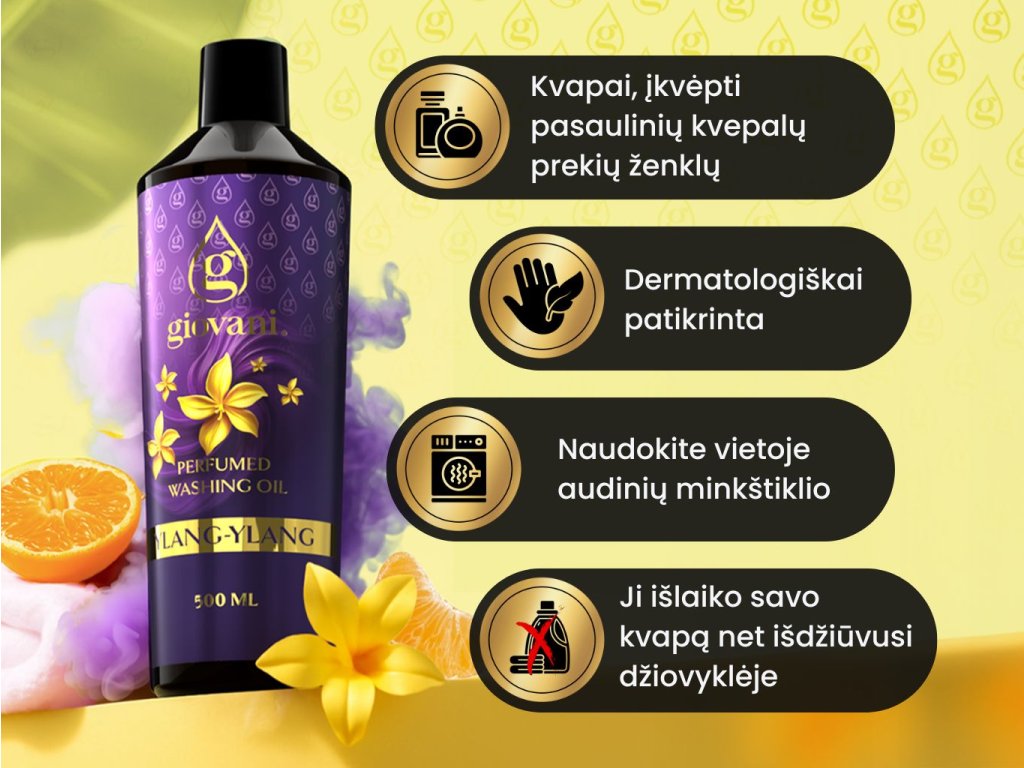 Pagrindinė Giovani® YLANG-YLANG skalbinių kvepalai esencija kilusi iš Komorų salų, kurios garsėja aukščiausios kokybės ylang ylang žiedais pasaulyje. Aromaterapijoje ši esencija naudojama stresui, nerimui mažinti ir geram miegui palaikyti.