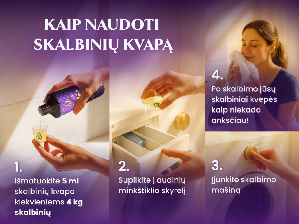 Nepilkite kvepalų į skalbyklės būgną ar džiovyklę. Jie skirti tiesiogiai naudoti audinių minkštiklio skyriuje. Jums nereikia nerimauti, kad džiovinant skalbinius džiovyklėje jie praras kvapą. Giovani® kvepalai yra atsparūs išoriniam poveikiui ir ilgai išliekantys. Išskalbti skalbiniai kvepės net ir po džiovyklės naudojimo. Optimali skalbinių kvepalų laikymo temperatūra yra apie 15-25°C.